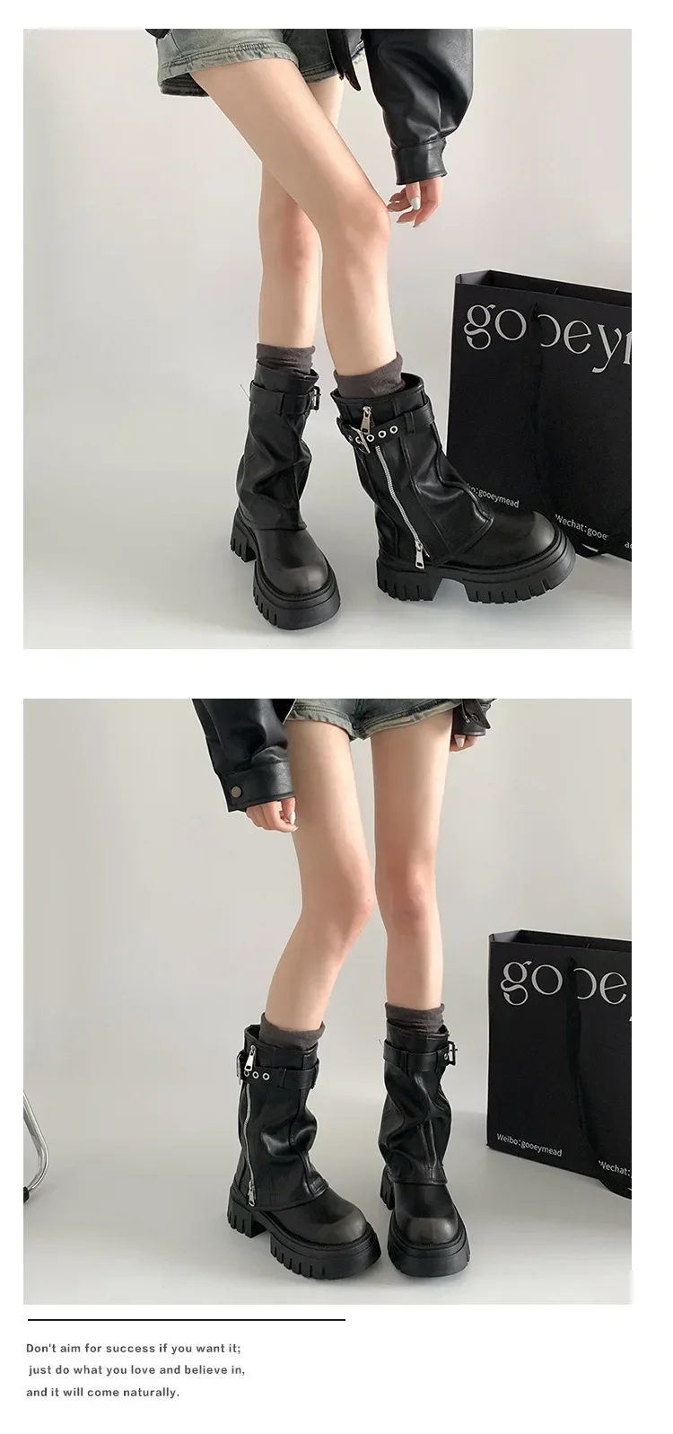 Women’s Winter Biker Boots Platform Knee-High Casual Belt Buckle Long Pipe Booties